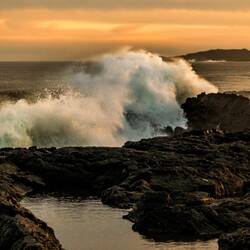 Abstecher zur Brandungsküste Nesvegur mit ansehnlichen Wellen im Abendlicht.
