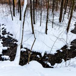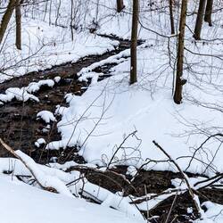 Der Haddesser Bach schlängelt sich durch das Falltal und zeichnet sich im verschneiten Talgrund besonders gut ab.