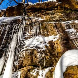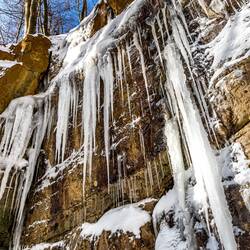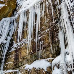 An einer Felswand am Wegesrand haben sich bei Nachttemperaturen um -18 Grad ansehnliche Eiszapfen gebildet.