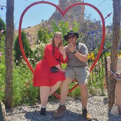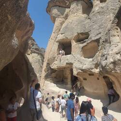 Ek het uiteindelik my alarm gehoor vanoggend en so het ons dag sommer vroeg vroeg begin... Ons was vroegoggend, vir sonsopkoms na die uitkyk punt om na al die lugballonne te kyk. Dit is weereens 'n belewenis wat nie in woorde beskryf kan word nie en voel so of ons in 'n fliek lewe! Ons is toe terug hotel toe, waar ons ontbyt geëet het en toe het die toerbussie ons kom oplaai. Ons het 'n lekker vol toer gehad en baie dinge gesien. Ons eerste stop was by die Imagination Valley, waar daar rotse is wat soos klomp verskillende goed lyk. Die duidelikste een, soos 'n kameel. Van daar was ons na die buitelug museum, wat ook 'n kerk in een van die rotse bevat. Mens mag ongelukkig glad nie foto's van of in die "kerk" neem nie en die ou wat daar werk is rerig baie kwaai! Laat my aan 'n Mafia mannetjie dink! Dit is nogsteeds 'n ongelooflike belewenis, veral om te sien hoe die mense die rotse, wat eintlik meer soos sand is, uitgehol en verander het om in te bly. Volgende was ons Monk Valley toe, waar die Monks gebly het... Ook in die grotte! Damian het in een van die huisies opgeklouter, maar ek het besluit dis vir my veiliger om buite te bly en 'n foto of twee van hom te neem. Die roomysmannetjie was ook vol dinge en grappe en net voor ons weggeloop het, het hy my linkerhand gegryp en vir my 'n cone as ring opgesit... Ons is toe na die Onyx en Souvenir winkel toe. Daar het hulle ons gewys hoe hulle Onyx sny en polish, nogal interessant! Hulle het ook klomp verskillende juwele daar. Ons het toe gou gestop vir middagete, ook in 'n grot, wat baie lekker koel was. Ons is toe na die Pottery plek toe, waar hulle ons gewys het hoe hulle al die verskillende borde en bakkies en so uit die klei uit maak. Baie indrukwekkend! Ons het die toer afgesluit by die Panoramic uitkyk punt, waar mens kon foto's neem. Dit was 'n baie lekker dag, maar vrek warm, aangesien die bussie se aircon nie gewerk het nie en dit mens nogals kan uitbrand. Na ons by die hotel afgelaai is, het ons gou gaan aandete eet en is ons nou in die bed, want moreoggend is 'n BAIE vroeë oggend!