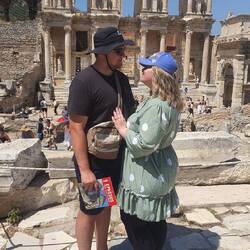 Wat 'n belewenis was vandag nie... Na ons opgepak en gou ontbyt by die hotel geëet het, is ons sak en pak oppad na Ephesus. Toe ons daar inry, wys die een ou ons waar om te stop. Hy hoor ons praat en weet dadelik ons is Afrikaans en vertel ons dat hy een van Leon Schuster se flieks gekyk het. Ons koop by hom 'n boekie oor Ephesus en hy reël vir ons vervoer na die bokant van die terrein toe. Hy sê ons moet 10 minute wag en toe daag ons perde en perdekar op! So oulik! Die ou hanteer sy perde baie mooi en ons geniet die rit vreeslik baie! Ons het oorspronklik gedink met die boek is 'n gids nie nodig nie, maar het toe besluit om een te kry. Ons is definitief nie spyt nie! So het ons deur die Ou Stad geloop en vreeslik baie interessanthede geleer. Hulle is nog besig met opgrawings en daar is van die goed wat sommer 'n week of twee gelede nog gevind is. Mens kan ook sien hoe hulle staan en skoonmaak en opgrawe en tekere gaan. Dis besonders! Na ons deur die Stad was, het ons toergids saam ons gery om geld te trek, aangesien hy kontant wou hê en ons nie gehad het nie. Hy vat ons toe gou by 'n leerfabriek in waar hulle vir ons 'n klein modeparade hou. Shame, die arme ou kry seker kommissie op die items wat verkoop word en het seker gedink ons het baie geld. Die items is ongelooflik mooi en word van skaap- en bokleer gemaak, so dis vreeslik sag en lig. Dis net jammer die pryse is so... R25 000 min of meer per item! Selfs die wat op uitverkopings is, is om en by R10 000. Die gids het so ewe vir Damian in die kar gesê toe ek uitgehop het om geld te trek, dat hy kan sien ek is lief vir hom, maar net so 80% lief vir hom... Maar hy sal sien, as hy vir my ietsie by die plek koop, sal ek 100% lief wees vir hom! Haha! Nee! Van daar het ons weer die gids gaan aflaai en is ons na Moeder Maria se huis toe. Dit word gesê dat dit die laaste plek van woning vir haar was voor sy oorlede is. Dis op 'n baie rustige berg, tussen klomp bome. Mens mag glad nie foto's neem as mens deur haar huisie stap nie en word ook nie toegelaat om te praat terwyl mens daardeur stap nie. Mens kan 'n kersie buite opsteek vir 5 TL elk en ons het toe so gemaak. Van daar af het ons toe gery Çannakale toe, wat naby Troy is. Ons het ons baie oulike woonstelletjie vir die aand gekry en het toe rustig op die Promenade gaan stap en aandete gekry. En dit was die som totaal van ons Dag 12...