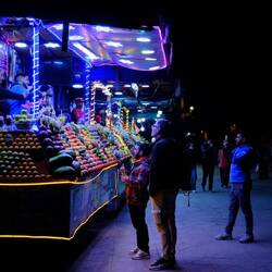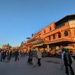 Wir halten uns nicht lang auf, denn wir wollen die letzten Sonnenstunden des Tages für ein paar Besorgungen nutzen. Wir brauchen Geld - klar - eine Sim-Karte, Wasser und Abendessen. Dabei bemerken wir, dass wir tatsächlich mitten im Zentrum von Marrakesh gelandet sind. Um unser Riad herum herrscht lautes, aufgeregtes Treiben. Unser Weg führt uns auf den riesigen Platz namens Jemaa el-Fnaa - ein Overload für die Sinne: Neben bunten Markt- und Essensständen werden Haare geflochten, Dienstleistungen in alle Richtungen geboten, Schlangen beschworen und Affen, Pfauen, ja sogar Meerschweinchen für Fotos gequält. Kaum auszuhalten, wie die Tiere hier ausgebeutet und behandelt werden. Schnell weiter!