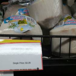 Baby Coconut - geschält und wenn man den Zipfel oben abschneidet kann man bequem daraus trinken (3,27$)