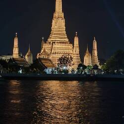 Cocktails und ein toller Ausblick von der Rooftop Bar auf den Tempel Wat Arun, der im Licht der untergehenden Sonne immer wieder anders aussieht.