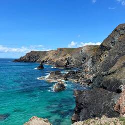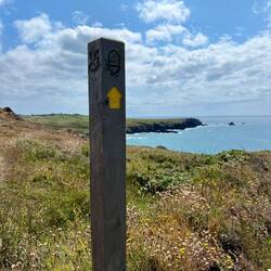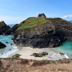 Started the day with a steep climb out of Porthcurno Beach - it was a tough day - lots of rocky ups and downs, thick brush with brambles and nettles. I had my first stumble - but only got minorLeia mais