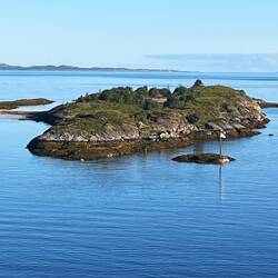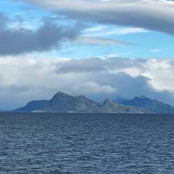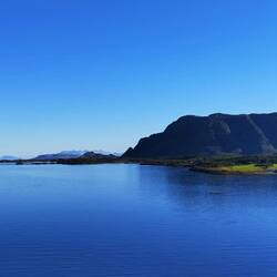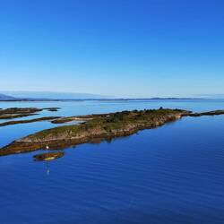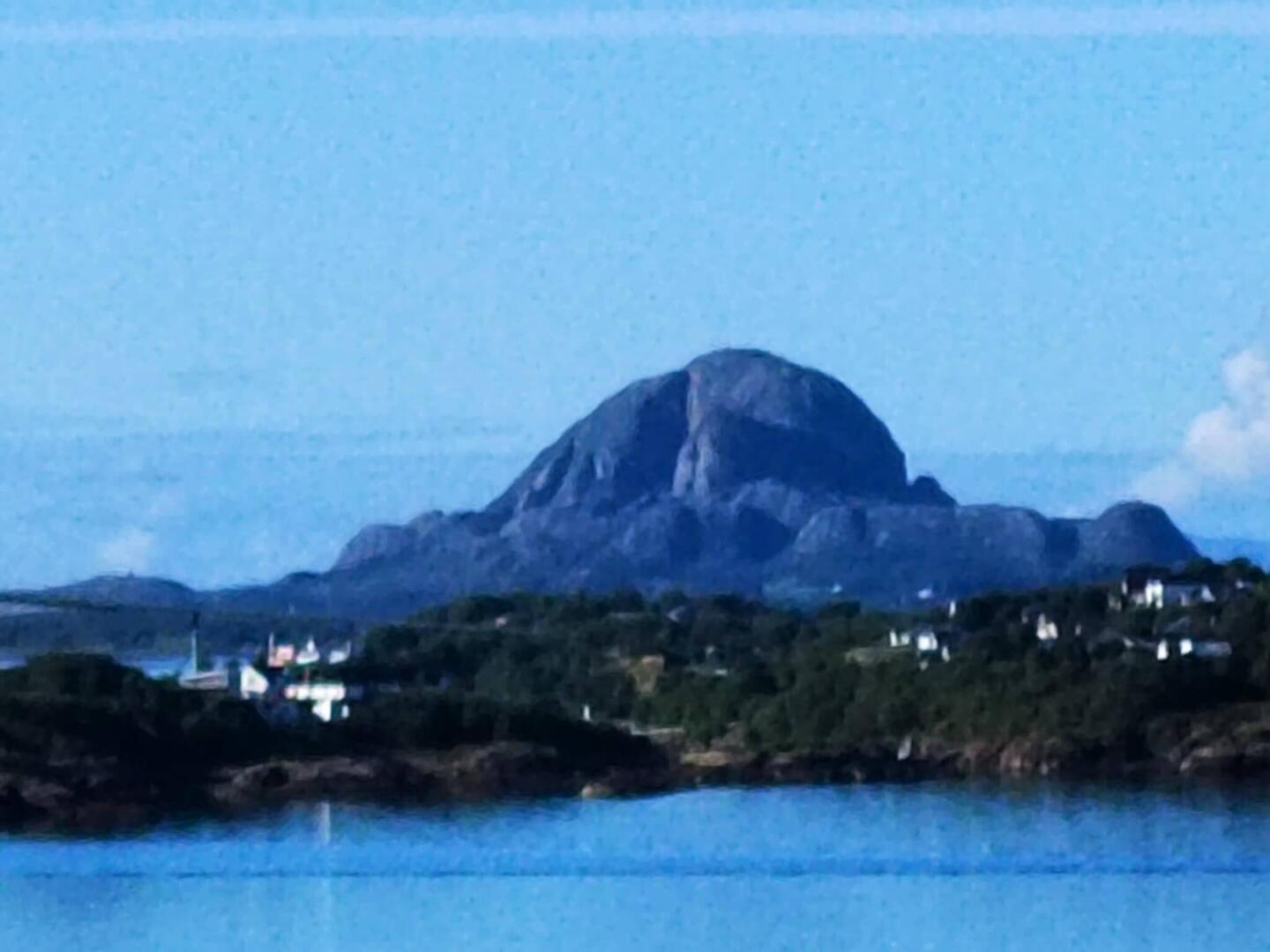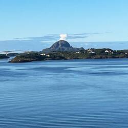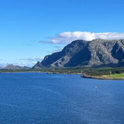 In Brønnøysund steht die Landschaft mit dem Torghatten Berg und die vielen kleinen Inseln im Vordergrund.