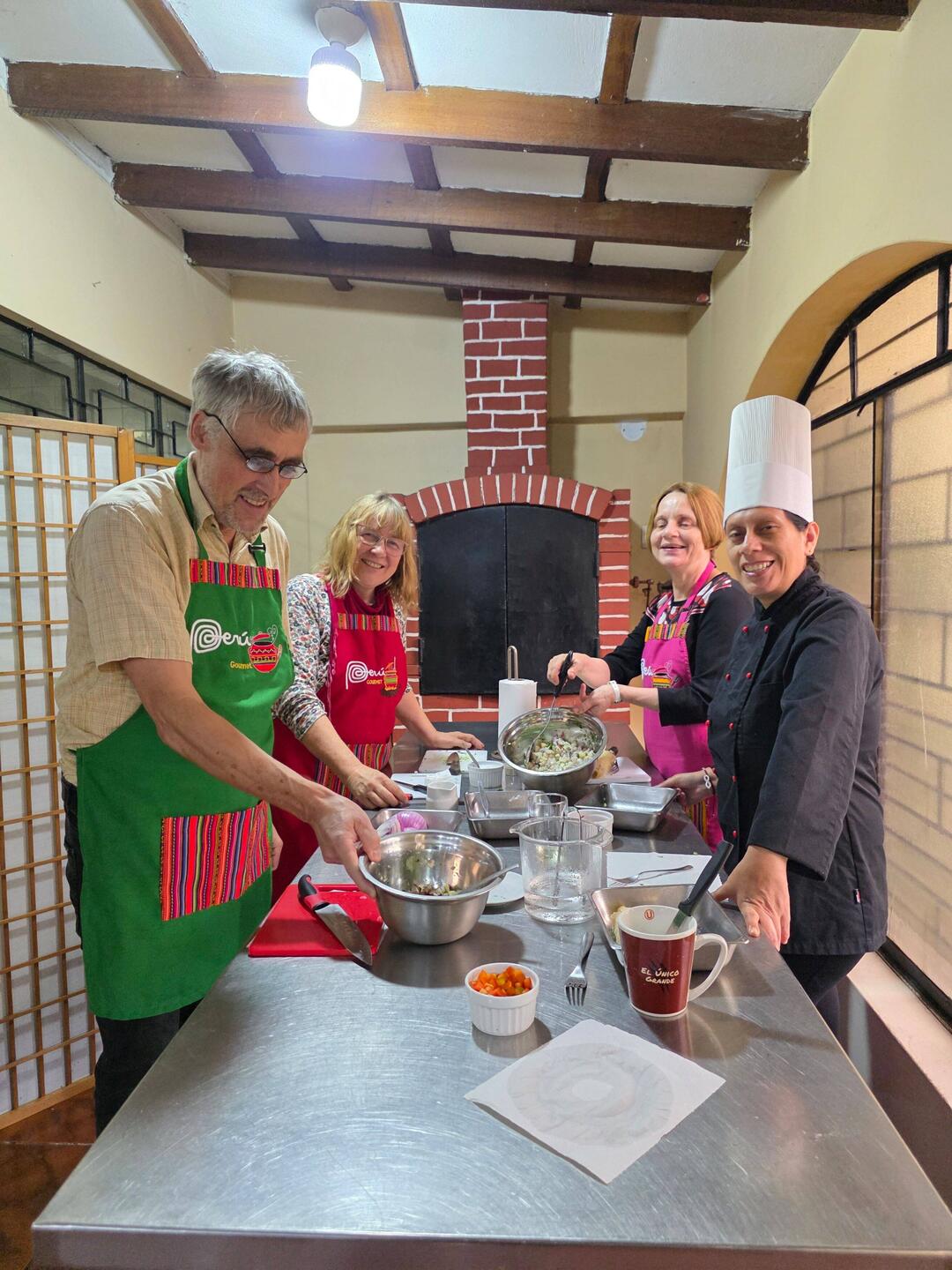 Nach herzlicher Begrüßung wird erstmal eine Obstplatte bereitet sowie ein leckerer Pisco-haltiger Cocktail. Dann folgen 3 verschiedene landestypische Vorspeisen, u.a. "ceviche", für Ina und mich mit Fisch und für Rüdiger mit Champignons. Für die Hauptspeise wird Rindfleisch in heißem Öl flambiert - wir sind alle mutig genug, es mal zu probieren, werden wohl trotzdem dieses Rezept nicht in unseren heimischen Küchen erproben 🫣😅