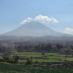 Heute verlassen wir Lima und begeben uns in den Süden Perus. Die Flugzeit nach Arequipa beträgt eine gute Stunde - mit allen Komponenten des Transfers sind wir den ganzen Vormittag beschäftigt. Wir überfliegen karge Gebirgslandschaften und haben nach den eselsgrauen Tagen in Lima wieder volle Sonne 🌞. Eine sympathische junge Frau holt uns vom Flughafen ab und zeigt uns die schönsten Ecken der Stadt.
