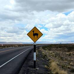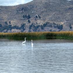 Wir nehmen Abschied von unserem wunderschönen Hotel am Colca-Fluss und werden nach Puno gebracht. Puno ist eine Stadt am Ufer des Titicaca-Sees, die etwa 120000 Einwohner hat. Auf dem Weg dorthin sehen wir reichlich Schafe, Lamas und Alpakas. Aber auch ein hasenähnliches Geschöpf, welches etwas größer ist als ein Hase und einen langen Schwanz besitzt. Wir halten unterwegs in 4900 Metern Höhe an einem wunderbaren Ausguck auf 8 Vulkane und ein wenig später sitzen wir in einer kleinen Lokalität, wo es zur Stärkung wieder Inkamate-Tee gibt. Die Mittagspause verbringen wir am Ufer des Lagunillas. Dieser große Süßwassersee liegt auf 4413 Metern Höhe und fließt in den Titicaca-See. Hier fühlen sich viele Vogelarten sehr wohl, u.a. Flamingos. Auf dem Weg gibt es auch eine durch Bauarbeiten bedingte Staustrecke - aber wir haben ja Zeit...