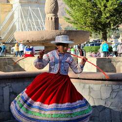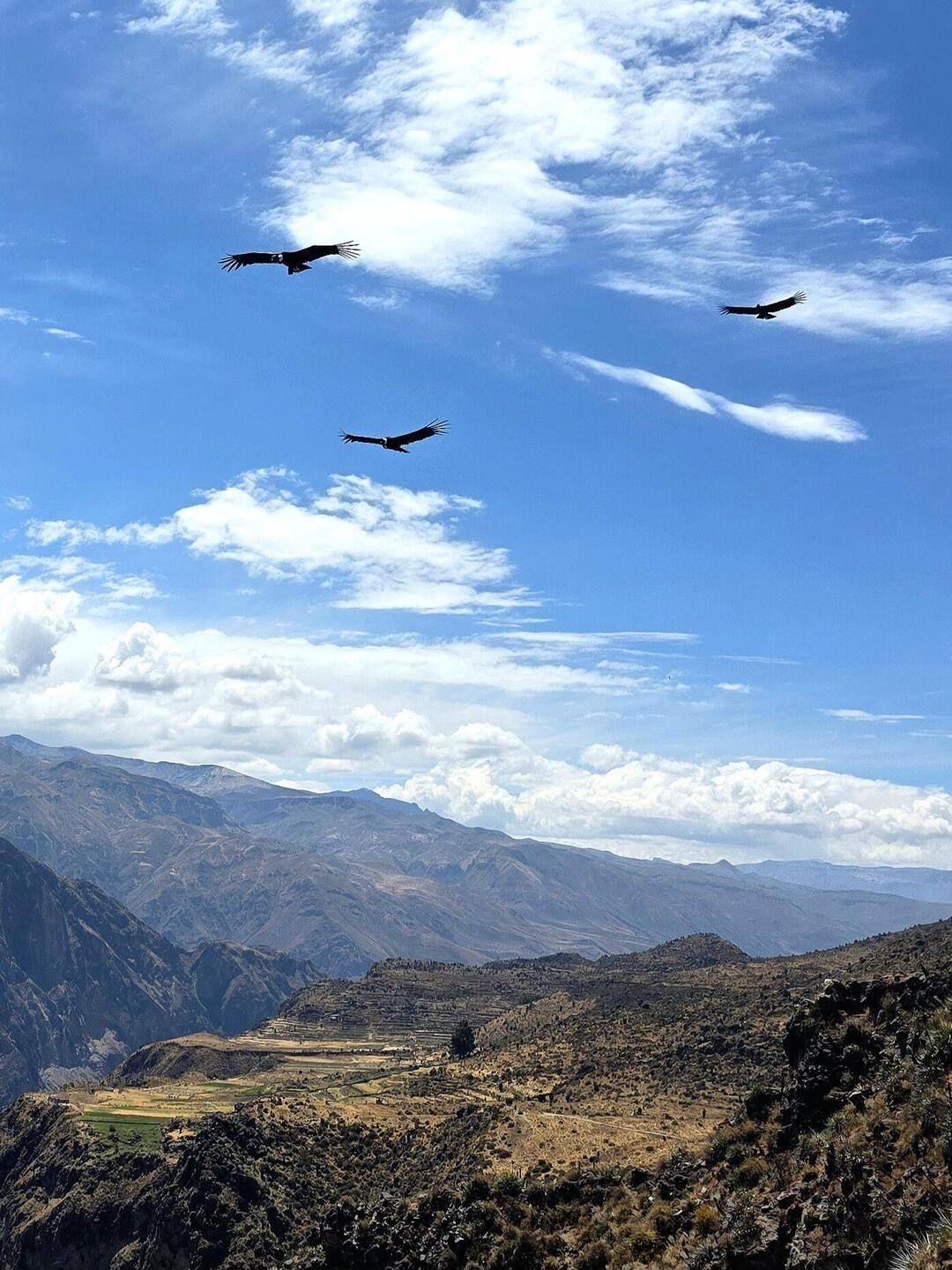 Heute bringt uns unsere Reisebegleiterin zu den schönsten Orten im Colca Canyon. Der Colca-Fluss hat sich tief in die Bergwelt eingeschnitten und eine imposante Landschaft geformt. An den Rändern sieht man zahlreiche terrassenförmige Felder, auf denen damals Landwirtschaft betrieben wurde - heutzutage scheint man auf diese Weise kein attraktives Leben führen zu können. So gibt es im Colca-Tal auch nur wenige kleine Orte, wo jeder jeden kennt. Da ist die Kleinstadt Chivay, in dessen Nähe unser Hotel ist, mit 5000 Einwohnern eine Ausnahme. Auf dem Weg durchs Colca-Tal besuchen wir den kleinen Ort Yanque, wo wir auf dem Hauptplatz eine Gruppe Mädels beim Tanzen beobachten können. Der Höhepunkt des Ausfluges ist eine kleine Wanderung am Rand des Canyons, wo die Thermik für den Flug des Kondors besonders günstig ist. Und wir kommen tatsächlich in den Genuss, diese imposanten Vögel zu beobachten. Der Andenkondor ist einer der größten flugfähigen Vögel der Welt. Die Männchen wiegen bis zu 15 kg. Mit einer Flügelspannweite von bis zu 3,2 Metern kann er stundenlang durch die Luft gleiten. Er gilt als Symbolvogel der Anden und spielt eine wichtige Rolle in der Kultur vieler indigener Völker. Als Aasfresser trägt er außerdem zur Gesundheit des Ökosystems bei.