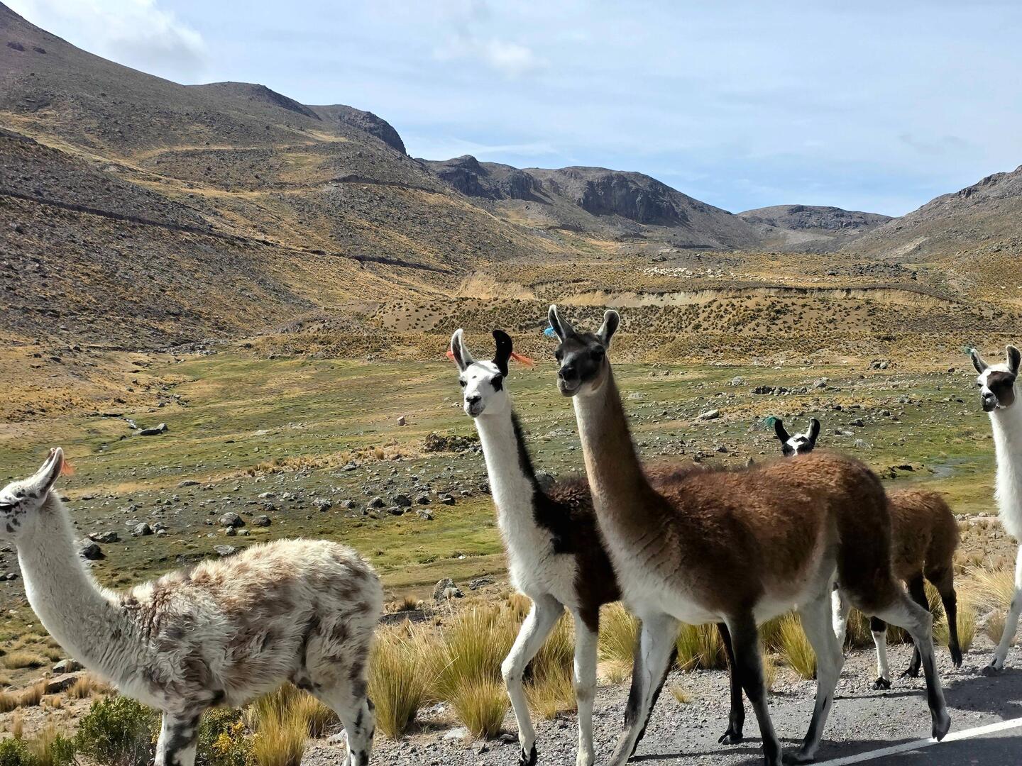Mit einem letzten Blick auf die stolzen Vulkane verlassen wir Arequipa. Wir erfahren, dass diese sehr wenig aktiv seien und nur alle paar Jahre ein kleines Wölkchen ausspucken. Zuletzt habe es im Mittelalter (vor mehr als 500 Jahren) ein etwas größeres Wölkchen gegeben, welches die Stadt mit einer Staubschicht bedeckt habe. Am Stadtrand halten wir noch an einem kleinen Laden an und kaufen auf Empfehlung unserer einheimischen Begleiter Cocablätter und einige andere pflanzliche Prophylaktika gegen die Höhenkrankheit. Wir fahren nun durch trockenes, verstepptes, weniger spektakuläres Gelände und bekommen von unserer Reiseleiterin noch einiges Wissenswerte über Arequipa erzählt. Neben der Haupteinkunftsquelle Bergbau (Kupfer und Molybdän) ist das Gebiet auch Spitzenreiter in der Produktion von Schildläusen (der rote Farbstoff befindet sich beispielsweise im Campari) und von Meerschweinchen. Wir erfahren, dass der Verzehr von Meerschweinchen eine stark rituelle Komponente hat und vorzugsweise zu besonderen Feierlichkeiten wie Hochzeiten oder besonderen Familienfeiern erfolgt. Unsere Reiseleiterin kommt etwa auf 2 Meerschweinchen pro Jahr.