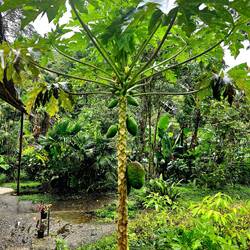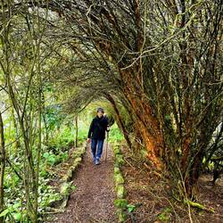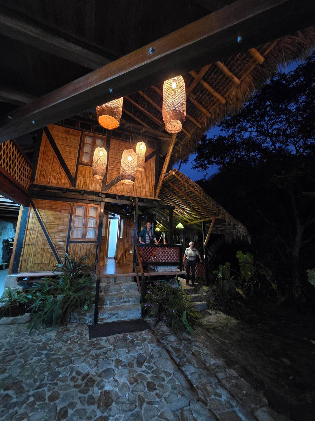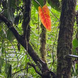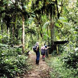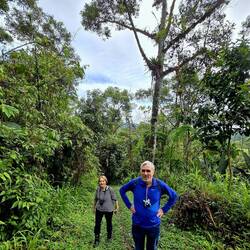 Nach dem Frühstück hört es prompt auf zu regnen, wir werden mit Gummistiefeln ausgestattet und machen uns mit einem waldkundigen Begleiter auf den Weg zu einer mehrstündigen Wanderung durch den Nebelwald. Sooo viele exotische Bäume, Sträucher und Blumen - da geht einem wirklich das Herz auf 🥰. Wir sehen auch interessante Schmetterlinge und Insekten sowie einen Tukan und einen Motmot. Unser Guide möchte uns einen der hier heimischen Brillenbären zeigen und läuft mit uns auf verschlungenen Pfaden Plätze ab, wo es durch aguacatillo-Bäume (Mini-Avocado-Bäume), deren Früchte die Lieblingsspeise des Brillenbärs sind, gute Chancen gibt, einen zu entdecken, aber da haben wir heute nun mal kein Glück. Die Dosis an glücklichmachenden exotischen Eindrücken ist allemal hoch genug, dass wir das verschmerzen können. Zum Mittagessen gibt es neben Fleisch und Gemüse "Innereien" aus der Yuccapalme - ein interessanter, kartoffeliger Geschmack. Beim Essen können wir muntere Kolibris beobachten, die wohl zur Freude der Touristen mit süßen Säften angelockt werden. Am Nachmittag regnet es wieder. Eine gute Gelegenheit, auf regengeschützter Terrasse mal in der Hängematte zu entspannen... 🫠