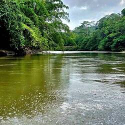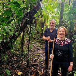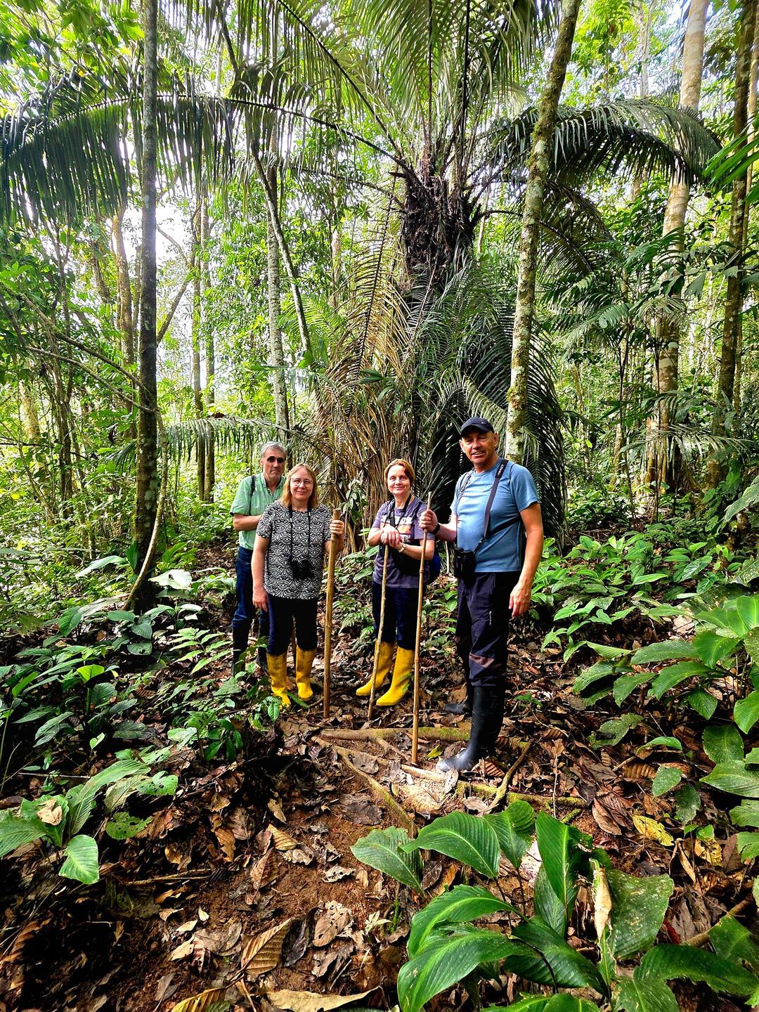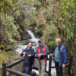 Nach einem Morgenbad in der Therme und einem guten Frühstück starten wir vom Hotel aus eine Wanderung durch den Andenwald. Im Gegensatz zum Nebelwald sind durch die Höhe (aktuell 3300 Meter) die Bäume niedriger - ein typischer Vertreter ist der "Papierbaum" - wenn man etwas Rinde ablöst, hat man das Gefühl, mehrere Lagen zarten Papiers in der Hand zu haben. Wir wandern an einem Fluss entlang und erfreuen uns wieder an der bunten Flora mit unzähligen Bromelien und Orchideen. Mit Brombeeren, Lupinen und Fuchsien gibt es eine gewisse Überschneidung mit unserer europäischen Flora. Mittags steigen wir ins Auto und haben eine lange Fahrt südostwärts ins Amazonas-Gebiet. Gefühlt geht es stundenlang bergab, regnet immer mal wieder, es sind stets grüne Landschaften, die wir passieren, teilweise mit schönen Wasserfällen. Am späten Nachmittag sind wir an einem Amazonasarm angelangt, haben uns auf ca. 500 Höhenmeter herunterbewegt, dafür von heute früh ca. 4-6 Grad auf 31 Grad hochgearbeitet (🥵), steigen in ein Boot und fahren in eine Lodge, die nur auf dem Wasserweg zu erreichen ist. Wir beziehen ein Freiluft-Appartement mit Blick auf den Fluss. Das Bad ist ein großer Balkon mit Sitzecke und Dusche, das Schlafzimmer mit Gazefenstern ausgestattet, welche die Mücken abhalten, jedoch alle exotischen Geräusche des tropischen Regenwaldes, in dem wir uns inzwischen befinden, passieren lassen. Vor dem Abendessen werden wir zu einer kleinen Nachtwanderung eingeladen und bestaunen erneut etliches Spinnengetier, aber auch Frösche und schlafende kleine Echsen. Mit einer Piña colada geht wieder ein sehr erlebnisreicher Tag zu Ende.Read more