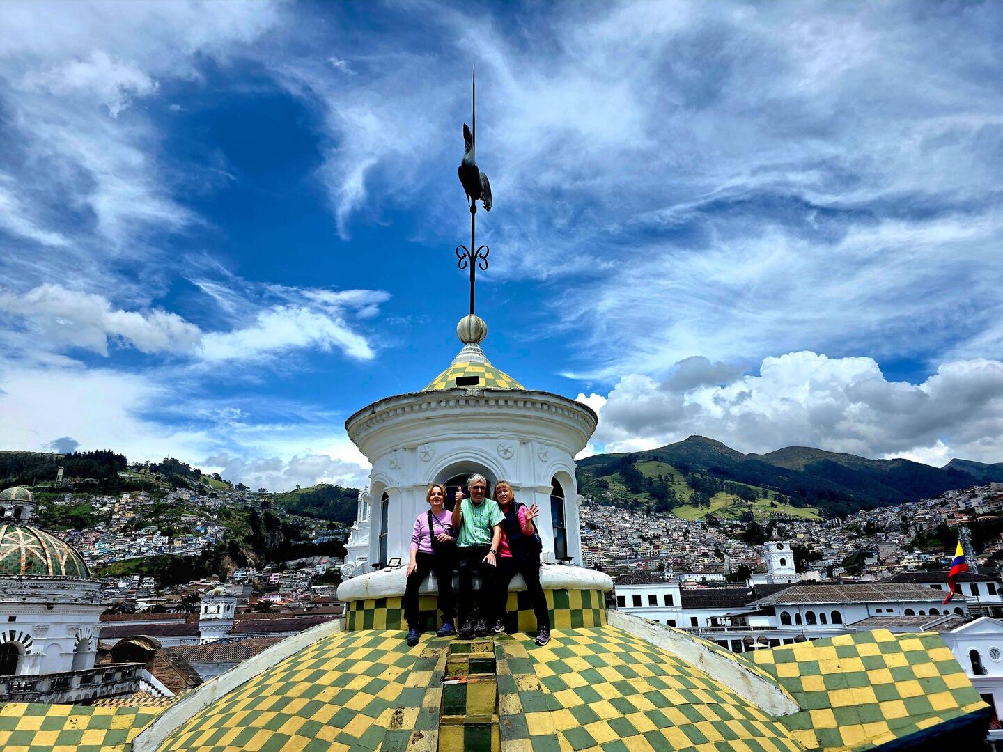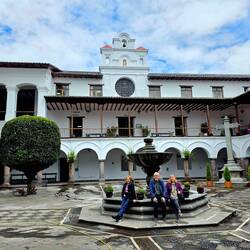 Unseren Stadtrundgang beginnen wir am Theaterplatz, wo man das älteste Schauspielhaus Lateinamerikas sieht. Im weiteren Verlauf erfahren wir, dass es in Quito 55 Kirchen gibt, die teilweise noch als solche genutzt werden, teilweise aber auch als Ausstellungsräume oder deren Kreuzgänge als attraktive Restaurants. Wir besichtigen die barocke Jesuitenkirche, die mit überwältigend viel Gold ausgestattet ist. Vorbei an der Augustinerkirche, wo 1822 die Unabhängigkeit Ecuadors unterzeichnet wurde, gelangen wir schließlich auf den Hauptplatz (la plaza de la independencia) und sehen den Regierungspalast, wo der 38jährige Präsident (einer der jüngsten Präsidenten der Welt!) arbeitet und mit seiner Familie lebt. Seine Anwesenheit erklärt auch die hohe Polizeipräsenz rund um den Platz. Weiter geht es zum Franziskanerplatz mit der Basilika San Francisco, wo wir vom Dach aus einen tollen Blick auf die Stadt haben und von der Empore eine kleine Weile einem Gottesdienst lauschen. Nach dem Stadtrundgang fahren wir mit unserem Guide zum Äquatordenkmal, etwa 25 km nördlich von Quito - die meist besuchte Sehenswürdigkeit Ecuadors. Eine Expedition französischer Wissenschaftler hat bereits 1735 - 1744 auf dem Gebiet des heutigen Ecuadors die Form unseres Planeten und die Äquatorlinie sehr exakt bestimmt. Ausgelassen springen wir von der Nordhalbkugel auf die Südhalbkugel und wieder zurück... 😂
