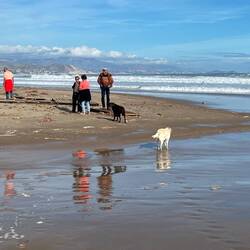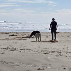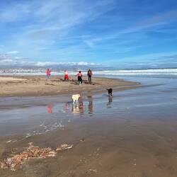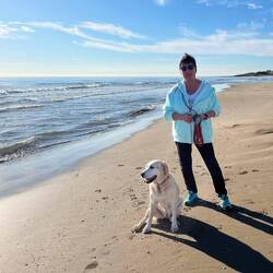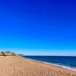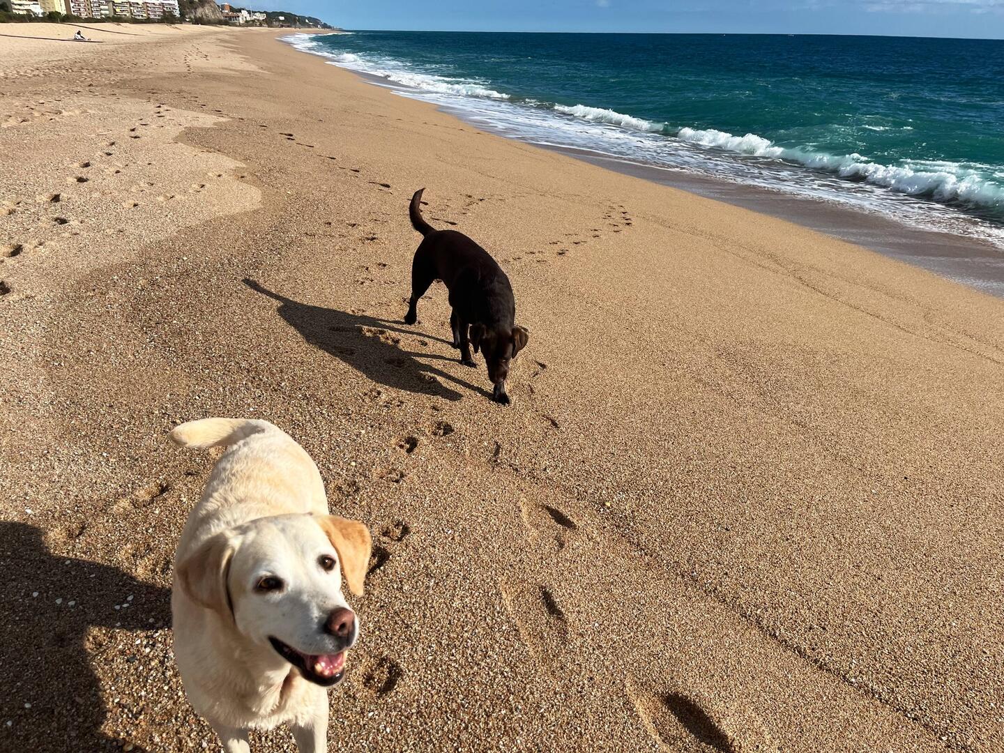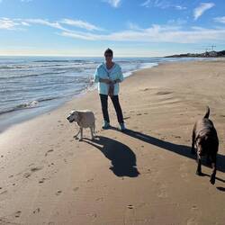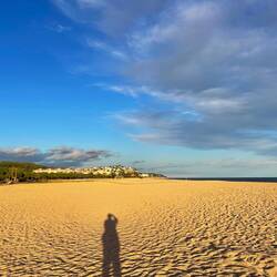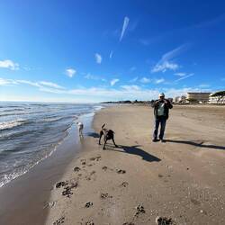 Wir sind endlich wieder am Mittelmeer! Der Strand hier ist phantastisch, wie in Rømø, breit und fest. Wir genießen den Hundespaziergang.