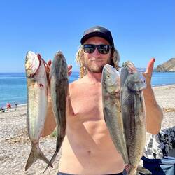 It was a beautiful arvo so Chris and I attacked the beach chasing Mulloway. We had plenty of action and landed a monster salmon, big gummy and an 83cm Mulloway which was only just over the legal size limit of 82cm. Unfortunately the Mulloway was full of worms. They looked like macro sperm and wiggled after being squeezed out of the flesh, there were heaps, so we decided to turf it. The gummy was good and tasted delicious in beer batter then shared with friends, there was heaps for everyone including the neighbours and still enough to freeze for another couple of meals.