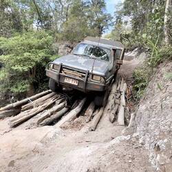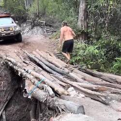 A scary, man made log bridge. We all held our breaths as the cars crawled over this one!