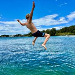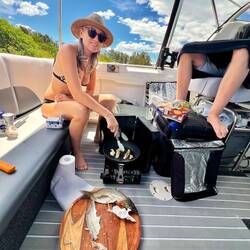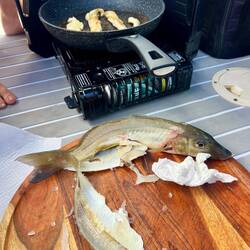 Spent our time swimming, eating nibbles, drinking Prosecco, fishing, and sun baking. We had fish and chips for dinner from the bridge takeaway and Loz andLes mer