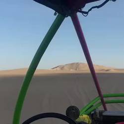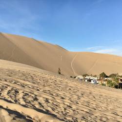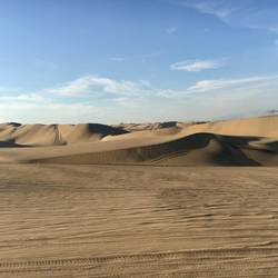 Als wir in Huacachina angekommen sind, war es schon dunkel und wir haben gar nicht gesehen, von welch riesigen Sanddünen diese Oase umgeben ist. Da war die Überraschung am ersten Morgen beim Öffnen des Vorhangs groß. Jetzt, zwei Tage nach Ankunft, erkunden wir die Wüste um uns herum mit Sandbuggies und Boards. Und diese Tour lässt wirklich keine Wünsche offen: pünktlich zum Sonnenuntergang düsen wir über die Dünen wie in einer Achterbahn. Wir dürfen zusätzlich insgesamt 6 Dünen Kopf voraus herunterrutschen. Dabei wird’s immer steiler und höher, aber das macht niemandem etwas aus - der Spaß ist einfach viel zu groß! 😬