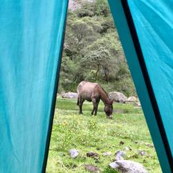 Die Stimmung ist aber schon beim Start gut und Americo und seine Crew kümmern sich sehr herzlich um uns. Mittags und abends gibt es jeden Tag drei Gänge zu Essen und morgens werden wir mit Tee im Zelt aufgeweckt (ja, seit dem gereizten Magen in Cusco hat sich sogar Evi an Tee gewöhnt... eine Hassliebe 😂). Alles schmeckt hervorragend und wir sind wirklich beeindruckt von der Leistung der ganzen Truppe. Immer vorauswandern, Zelte aufbauen, kochen, alles für uns vorbereiten und danach alles wieder aufräumen, abbauen, auf die Mulis packen und schnell los. Wenn wir helfen wollen, wird uns das immer verboten. 😉