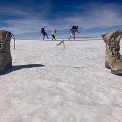 Erst geht es über Gestein, dann spitzt ab und zu schon der Gletscher durch das Geröll und irgendwann sind wir dann mit Steigeisen nur noch auf dem Eis unterwegs. Unser Führer bringt uns zu Höhlen und interessanten Formationen und erklärt viel zum Gletscher. Leider auf Spanisch... aber wir machen ein kluges Gesicht und lächeln freundlich 😉. Auch wenn wir nicht alle Details verstehen, so ist der Tag doch ein einmaliges Erlebnis. Schließlich läuft man nicht oft auf jahrhundertealtem Gletschereis. Besonders beeindruckend sind die leuchtenden Blautöne und die Geräusche, die der Gletscher von sich gibt wenn er irgendwo bricht. Wirklich toll, dass man dem Ganzen hier so nahe kommen kann.