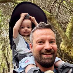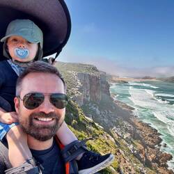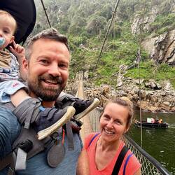 Am kommenden Morgen packen wir Momo in seine Trage auf Pits Schultern und gehen den Küstenweg in der Mündung des Stormsrivier-Flusses. Es ist ein gut befestigter, kurzer Weg zu einer Hängebrücke, die die letzten Meter des Flusses überspannt, bevor er im Meer verschwindet. Keine große Wanderung, auch das Wetter ist heut nicht optimal, aber landschaftlich ist es trotzdem wunderschön, die Strecke klappt mühelos mit dem Junior und es ist auch nicht zu heiß. 👍