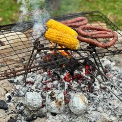 Bevor wir zu unserer Hütte zurückkehren, gönnen wir uns im Örtchen Stormsrivier noch ein landestypisches Mittagessen und genießen danach wieder die Abgeschiedenheit unserer Unterkunft. Leider beginnt es nachmittags immer mal wieder zu regnen. Pit schafft es aber trotzdem, unser Abendessen auf offenem Feuer zu grillen. 🔥