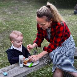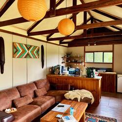 Als wir kurze Zeit später in unserer Hütte ankommen, fühlen wir uns sofort wohl: alles ist schön eingerichtet und sauber, wir sind wirklich mitten im Nirgendwo und blicken auf Berge und einen Wald. Außerdem hat die Hütte das wahrscheinlich schönste Klo mit Dusche unter freien Himmel, das wir jemals gesehen haben. Die Gastgeberin Caroline wohnt mit ihrer Familie nicht weit entfernt und begrüßt uns unfassbar lieb und herzlich.