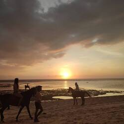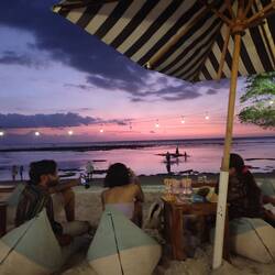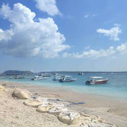 Nach 2,5 Stunden sind wir dann in Ubud angekommen. Dort haben wir Jutta und Pia rausgeschmissen und für mich ging's weiter - Ubud hab ich schließlich schon mit Nele gesehen. Von Padang Bai ist mein Speedboot gefahren. Kurz vor meiner Endstation kam der Fahrer nicht mehr weiter. Die Straße war dicht. Bei den engen Straßen ist irgendein Depp (nett gemeint) auf Überholmodus gewesen und hat dann die ganze Straße versperrt. Nichts ging vor oder zurück. Nachdem alle Fahrer ausgestiegen sind und ewig versucht hatten das Problem zu lösen hab ich nach 20 Minuten beschlossen die letzten Meter zu Fuß zu gehen. Für ein Mittagessen war auch noch Zeit, bevor die Fähre dann los ging. Diesmal war es tatsächlich nicht ganz so schlimm, als das letzte Mal als ich auf Nusa Penida gefahren bin. Es war zwar schnell, aber hat nicht ganz so gewackelt. Nach 1,5 Stunden bin ich dann angekommen. Direkt begeistert von der Insel. Eine ganz kleine Insel vor Lombok. Hier fahren keine Autos, Roller oder andere motorisierte Verkehrsmittel. Es gibt Pferdekutschen (was ich aufgrund von der Tierquälerei aber blöd finde) und Fahrräder. Also ging es zu Fuß 10 Minuten zur Unterkunft. Die Insel ist wirklich klein, da kann man alles zu Fuß machen. Trotzdem habe ich mir nachdem ich meine Wäsche in die Laundry gegeben hab ein Fahrrad geliehen und bin Richtung Sonnenuntergang geradelt. Endlich ein Sonnenuntergang, den ich hier so klar sehen konnte. Bequem in den Sitzsäcken und nem erfrischendem Drink. Die Pferde am Meer, die man sich buchen kann um im Sonnenuntergang zu reiten sind schon toll, aber da kommt wieder die Tierliebhaberin in mir raus (ja ich weiß, ich hab in dem Urlaub auch schon Dine getan, die für die Tiere bestimmt nicht optimal sind). Hier ist eben ultra laute Musik, viel Tourismus und dann die Pferde die hauptsächlich genutzt werden um das perfekte Foto auf ihnen zu shooten (muss nicht sein). Die Musik war aber richtig gut die aus allen Bars und Clubs zu hören war. Nach dem Sonnenuntergang bin ich weiter geradelt und hab bei einem Open Air Kino mein nächsten Halt gemacht. Leckeres Essen und ein Drink. Es lief der Film 'Luca' auf englisch - ich habe man mag es nicht glauben fast alles verstanden (ich werde vielleicht doch noch gut in Englisch) 😁. Danach war's dann dunkel. Und wie soll es auch anders sein, haben die Fahrräder hier kein Licht. Ich also durch irgendeinen Sandweg und das verlassenste Stück der Insel im Dunkeln auf dem Rückweg ins Hotel. Mein Handylicht hat da auch nicht mehr viel gebracht. Ich bin froh das ich rechtzeitig bremsen bzw. absteigen konnte, weil der Stein vor mir hätte mich fast umgebracht. Ist aber alles gut gegangen. Hat zwar ein wenig gebraucht meine Unterkunft wieder zu finden. Aber nach dem dritten Mal vorbei fahren, hab ich s dann auch geschafft.