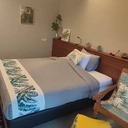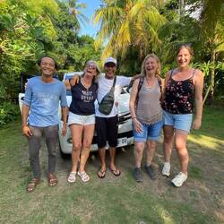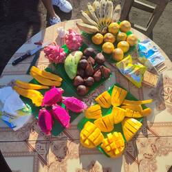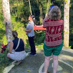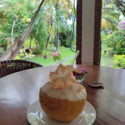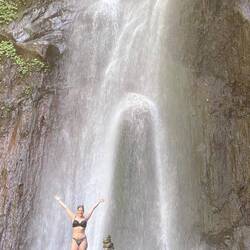 Im Anschluss haben wir uns von Tilli beraten lassen, was wir alles unternehmen und sehen sollten. Also ging es für uns mit dem Roller zum Fes Wasserfall. Pia bei einer Fahrerin der Unterkunft drauf und ich bei Jutta. Am Parkplatz angekommen sind wir zu dritt einen richtig schönen Weg etwa 20 Minuten bis zum Wasserfall gelaufen. Der Wasserfall war nicht nur schön, sondern auch erfrischend bei der Hitze. Noch nie stande ich solange unter einem Wasserfall. Das beste war, dass es nicht überlaufen war und es ziemlich ruhig war. Auf dem Rückweg Parkplatz haben wir uns noch eine frische Kokosnuss gegönnt. Dann ging's auch schon wird auf die Roller und ab zu unserer Massage die wir uns am Vormittag für den Mittag in unserer Unterkunft reserviert haben. Nach einer Stunde Massage war ich so entspannt, dass ich mich wie auf Drogen gefühlt hab. 😂 Dann bin ich erstmal ein bisschen im Dorf rumgelaufen. Alle grüßen einen hier und hatte auch ein nettes Gespräch mit einem Einwohner hier, der selbst für zwei Jahre in Deutschland gelebt hat und dort einen kleinen Sohn hat. So freundlich und nett sind die Menschen hier.