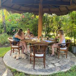 Beim Abendessen haben wir dann nochmal die nächsten Tage geplant. Am Samstag soll es für uns nach Lovina gehen, um hoffentlich Delfine zu sehen. Der kleine Junge von den anderen Gästen hat mir schon erzählt, dass er da heute hingeht und mir heute Abend erzählt wie es war. Wir waren heute eine Wanderung machen. Ich sag's euch. Nicht so einfach. Das es mich nur einmal hingelegt hat wundert mich. Die Tour ging durch die Villages of Muntigung. Dort im arbeiten und Leben Balinesen, welche nicht so privilegiert sind. Durch ein Projekt, welches durch ein Schweizer ins Leben gerufen wurden ist, werden Wassersysteme gebaut um das Wasser zu transportieren. Früher haben sie jeden Tag pro Person 10 Liter Eimer jeden Tag noch eine weitere Sträke als die wir gelaufen sind transportier. Würde ich niemals packen. Das Projekt zielt darauf ab Arbeit und Gemeinschaft zu fördern. Wer mehr wissen will: https://mas.muntigunung.com/moderate-trekking/ . Wir haben von unserem Guide sehr viel über das Leben dort erfahren und gesehen wie Körbe geflochten werden, Hängematten gewoben und die Batiktechnik funktioniert. Außerdem haben wir gesehen wie die Cashewnüsse zu der Nuss die wir kaufen verarbeitet werden. Es war ein richtig richtig schöner Tag und das Leben hier auf Bali wirklich so nah zu erleben. Zum Abschluss gab es noch ein leckeres Essen direkt am Meer. Ich kann die Tour jedem empfehlen, der sich mal im Norden von Bali aufhält. Wir hatten unseren Spaß. Es war einfach mega hammer (die Worte hat der Guide heute von uns gelernt). 😂