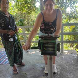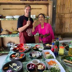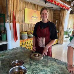 Uiii, was soll ich sagen. Meine Halsschmerzen sind noch da, aber die gute Laune auch. Trotzdem habe ich heute die Hölle hinter mir. Als ich mich heute morgen auf den Weg gemacht hab, habe ich noch nicht geahnt was mich nach meinem Mango Smoothie, welchen ich zu mitgenommen hab, während ich auf das Speed Boot am Hafen gewartet hab, erwartet. Als ich nach längerem Warten auf dem Boot war, war mir schon kotzübel, weil es so furchtbar heiß auf dem Boot war. Zu meinem Glück ging das Fenster nicht auf. Es waren gefühlt 50 Grad. Dann setzt sich auch noch ein indischer Mann neben mich und hält Smalltalk mit mir. Er ist nach kurzer Zeit eingeschlafen, hat noch mehr geschwitzt wie ich und ich hatte die ganze Zeit Angst, dass seine Schweißperlen mich berühren. War ein richtiger Ekelmoment. Ich hab fast keine Lust bekommen und die Sitzbank war dazu auch noch kaputt. Eigentlich sollte die Fahrt 2 Stunden gehen. Ja eigentlich - denn sie ging 3 Stunden. Ich weiß wirklich nicht wieviel Atemübungen ich gemacht habe, dass ich das überstanden hab. Dazu war ich nun viel zu spät dran, weil ich mich um 14 Uhr mit Jutta zu einem Kochkurs abgeholt werden sollte. Also zack vom Boot runter und den nächstem Driver genommen. Der wollte natürlich eine unmenge an Geld für die Fahrt. Direkt runtergehandelt und los ging's. Super Fahrer bekommen, aber war mehr damit beschäftigt Google Maps zu verfolgen als Smalltalk zu führen. Mir war klar ich schaff es niemals bis 14 Uhr. Also mit Jutta geschrieben und nach einem langen hin und her meinem Fahrer das Telefon in die Hand gedrückt, der dann irgendwas mit ihrem Fahrer ausgemacht hat. Also wurde ich an einer Ecke rausgelassen und hab dort gewartet bis ich wieder aufgesammelt wurde. Und dann ging's genau 500 Meter weiter zum Kochkurs 😂. Außer uns hat noch ein französisches Pärchen teilgenommen. Die Frau und ihr Mann waren super lieb haben uns alles Step by Step erklärt. Wir haben von Nudeln und Reis bis Dessert alles gekocht. War ein richtiges Festmahl am Ende. Haben die Rezepte mitbekommen werde ich definitiv nachkochen. Es war so so so lecker.