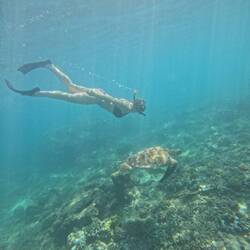 Heute morgen bin ich dann auf eine Tour gegangen nachdem ich ein leckeres Frühstück im Hotel zu mir genommen hab. Mit meinem Bike bin ich richtig Treffpunkt gefahren. Früh morgens um 9 Uhr mit dem Fahrrad zum Strand zu fahren hat schon was. Es war eine Schnorcheltour. Und ich hab so sehr gehofft Schildkröten zu sehen. Und yes, hab ich. Nicht nur eine. Es waren immer wieder welche zu sehen. Wir waren knapp eine Stunde im Wasser und sind mit den Schildkröten geschwommen. Dann hieß es auch schon Group Bali Kana geht weiter. Beim zweiten Spot hab es viele bunte Fische zu sehen. Und zu meinem Glück auch nochmal eine Schildkröte. Hab mich richtig erschrocken als der Guide mir plötzlich hecktisch auf die Schulter geklopft hat, dass ich sie sehe. Beim dritten Spot bin ich dann nicht mehr ins Wasser. Ich hab meine Schnorchelausrüstung für eine bessere Sicht davor bin Spülmittel gewaschen und hatte die ganze Zeit schon so ein Spüli Geschmack im Mund, das mir nach zwei Stunden schnorcheln der Geschmack echt zu viel wurde. Also hab ich mich solange auf dem Boot gesonnt. Zu sehen hätte es die bekannte Statue im Meer gehabt. War aber sowieso so voll, da hab ich glaube (hoffentlich) nichts verpasst. Auf Gili Air haben wir nach eine Pause eingelegt und zu Mittag gegessen. Eine noch kleine Insel auf der wirklich nichts los ist. Dort gibt es ein Schildkröten Schutzgebiet mir Babyschildkröten. Die haben wir uns auch noch angeschaut. So witzig wie sie versuchen in dem Becken immer wieder zu schwimmen.