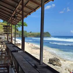 Den Tag haben wir für ein paar Stunden im Meer verbracht. Hier sind rießige Wellen und unglaublich viele Surfer. Macht richtig Spaß ins Meer zu gehen und mit den Wellen zu treiben. Nach der Erfrischung ging's dann ins Zentrum nah Uluwatu. Als wir angekommen sind ging es Pia gar nicht gut. Übelkeit und der Kreislauf. Also direkt in ein Restaurant und Cola bestellt. Hat leider aber nichts gebracht. Ihr Essen hat sie auch nicht essen können. Hat aber sehr gut dort geschmeckt.