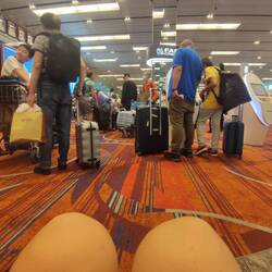 Danach bin ich nochmal über Chinatown geschlendert bis ich mein Gepäck gegen 15 Uhr aus dem Hostel geholt hab. Hab mir gedacht, da es mir dem Online einchecken nicht funktioniert hat fahre ich schonmal an Flughafen und halte mich den restlichen Tag vor Ort auf. Ich mein gegen shoppen am Flughafen spricht ja nicht. Auch sonst gibt's am Flughafen genug zu sehen. Angekommen sollte ich an Early Check In Schalter in untersten Stock. Hab mich schon gefreut den schweren Rucksack endlich los zu werden. Aber das wurde nichts. Weil ich bin nicht im System für den Flug registriert. Also sollte ich in einer halben Stunde nochmal kommen. Joa, hab ich dann gemacht. Aber könnte immer noch nicht geklärt sein. Angeblich sei der Flug auf die Person gebucht, die eigentlich mit sollte, ich bin aber nicht registriert. Wow, heißt warten. Erst neben meinem neuen Freund am Schalter auf einem Klappstuhl und nach einer Stunde wurde ich dann gebeten um halb 9 Uhr zum Hauptschalter zu gehen. Aaaaaah, warten warten warten. Endlich nach 4,5 Stunden warten darf ich jetzt mitfliegen. Endlich bin ich mein Rucksack bei der Gepäckaufgabe los geworden und kann jetzt noch entspannt auf meinen Flug warten. Die Zeiten für meinen Zwischenhalt in Istanbul haben sich angeblich auch schon wieder geändert. Mal schauen ob ich mein Flug von dort aus bekomme. Wenn nicht gibt's erstmal Simit zum Frühstück. Es bleibt also immer noch offen wann ich wirklich in Stuttgart landen werde. Ich bleib gespannt und gelassen.