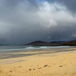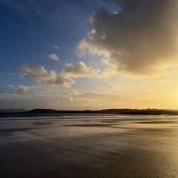 D’abord, la côte ouest, montagneuse et spectaculaire, avec des falaises abruptes qui résistent à l’assaut des vagues. Des criques ou plages de sable blanc, parsemées de roches noires, bordées de dunes coiffées de graminées et soufflées par un vent omniprésent, et où les marées rythment l’accès.