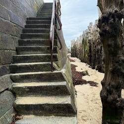 Vers deux heures, nous arrivons à Cancale et décidons d’y passer notre après-midi. La ville longe la baie et semble être serrée contre la falaise. Tout nous séduit, en commençant par la plage, la lumière qui inonde la baie, ou l’ostréiculture des huîtres plates ou creuses. À l’horizon, au loin, toujours le mont Saint-Michel. Autour d’un plat de fruits de mer, nous décidons de rester pour la nuit et trouvons un appartement avec vue sur la mer, juste à deux pas du port.