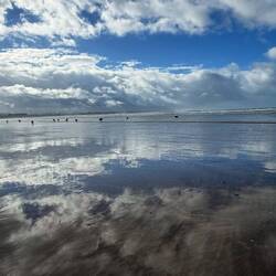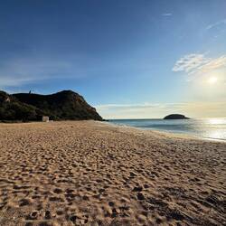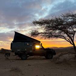 Le programme d’aujourd’hui: 4h30 du matin au bord d’une plage. Le vent tourne, des rafales latérales font trembler la voiture et tirent violemment sur notre toit levé. Nous sommes obligés de baisser la tente et de réorienter la voiture avant de nous recoucher. Une heure plus tard, une pluie violente s’abat sur nous et semble noyer le paysage, puis, un lever de soleil magnifique devant un ciel immaculé.
