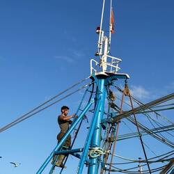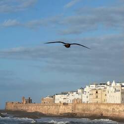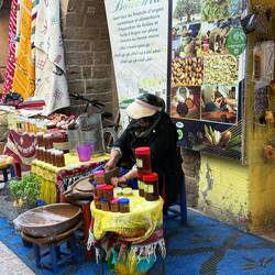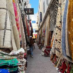 Puis il y a Essaouira, entre Safi et Agadir, où nous avons décidé de passer Noël dans un Riad, une oasis cachée derrière des murs discrets en plein cœur de la médina classée au patrimoine mondial de l’UNESCO. L’arrivée est spectaculaire, coincée entre un mur d’enceinte datant du XVIIIᵉ siècle d’un côté et le port de l’autre. Nous trouvons facilement un parking surveillé pour la voiture, puis commençons l’exploration des ruelles sans fin, bordées d’innombrables stands, shops et boutiques. Et pourtant, il est presque impossible de s’y perdre: tout semble suivre une certaine logique, sans doute aussi parce que la plage, le port et le fort l’encerclent sur trois côtés. En arrivant, nous passons devant une synagogue historique. Depuis notre chambre, nous entendons le muezzin appeler à la prière et les cloches d’une église, un peu déréglées, marquer l’heure.