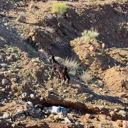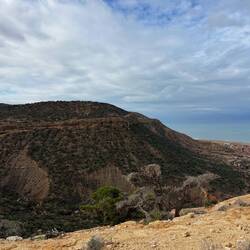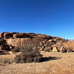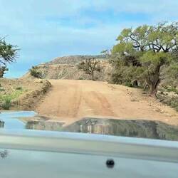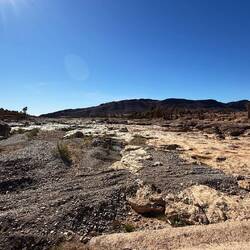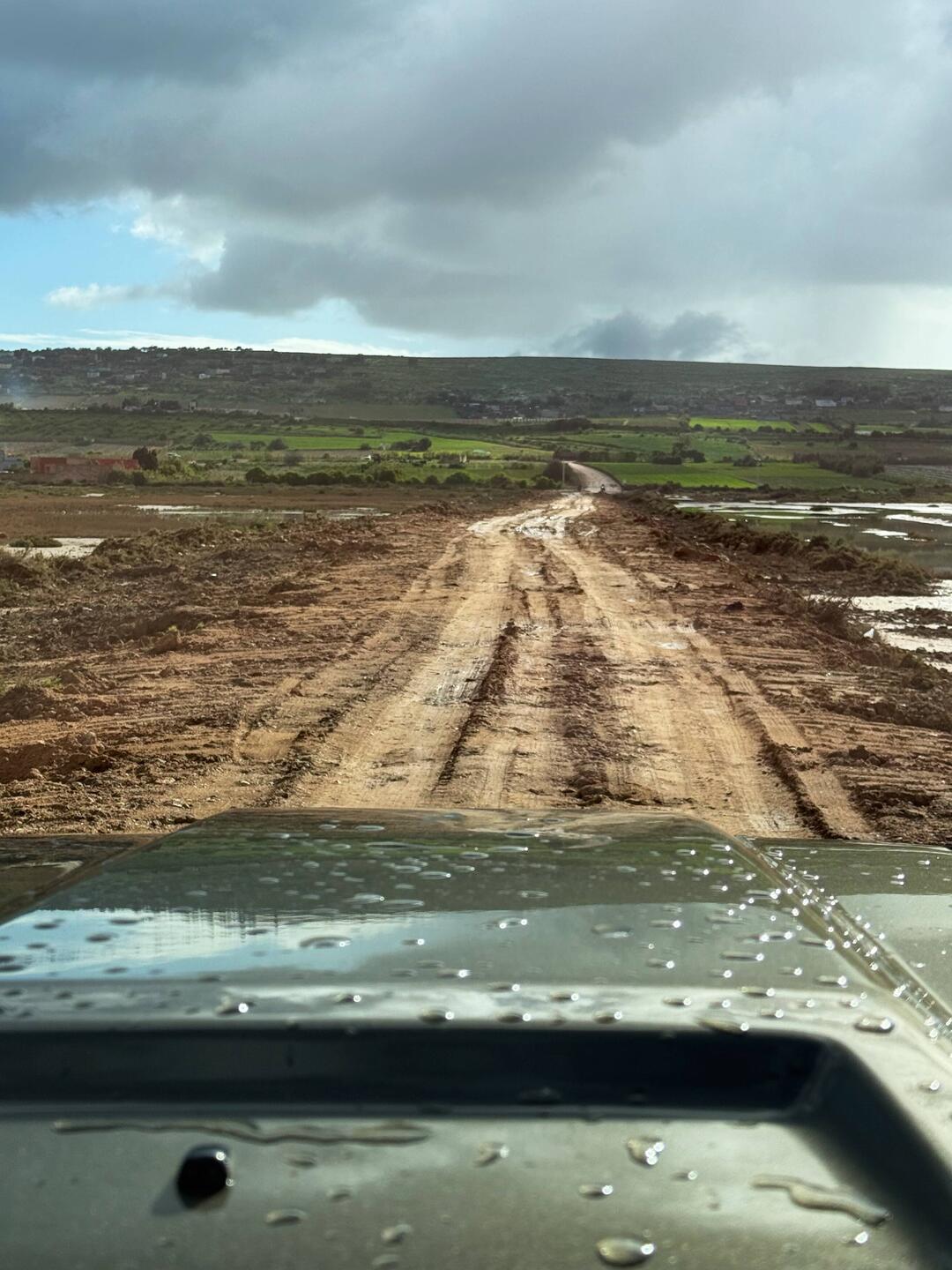 L’entrée n’est bien entendu pas à l’endroit indiqué, mais à quelques kilomètres de là. Nous nous aventurons dans une piste qui varie entre cailloux, sable et oueds asséchés, à travers un paysage aride et désertique, avec une végétation basse et dispersée, qui semble s’accrocher au sol.