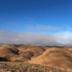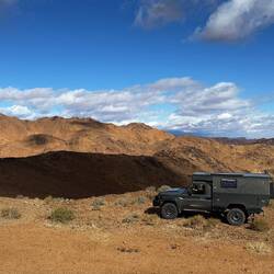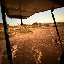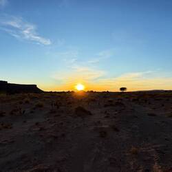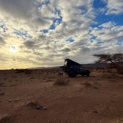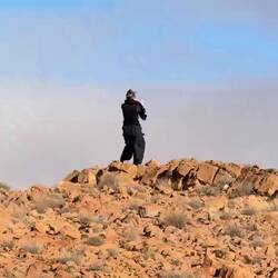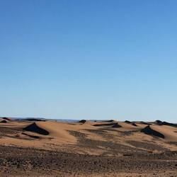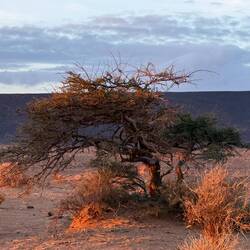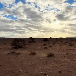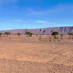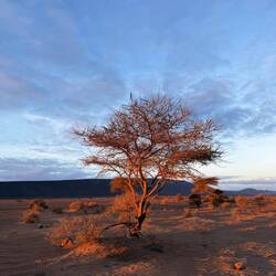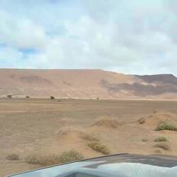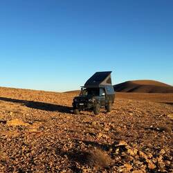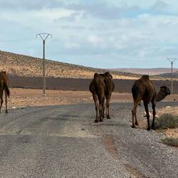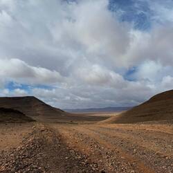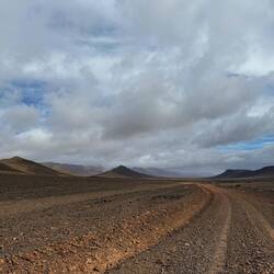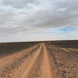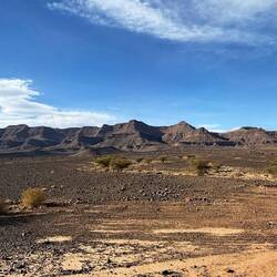 Réveillés à l’aube par le soleil qui se lève, quelque part au beau milieu d’un horizon qui nous paraît infini. Pas de visites nocturnes cette fois-ci: le fait de nous être planqués sous un arbre a dû servir de camouflage😏. Après notre premier petit déjeuner «en terrasse», nous avons repris la route, ou plutôt la piste, en direction d’Assa, à travers des plateaux pierreux, aux couleurs ocre, brune et grise, avec quelques campements nomades sahraouis au loin. Puis, en montant pour traverser les collines, la hamada, un sol rocheux presque nu.