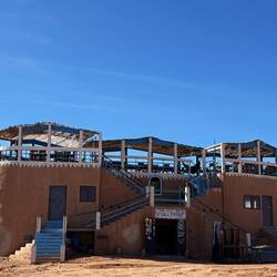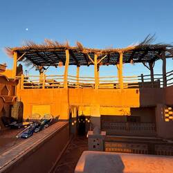 Pile à l’heure où la faim se manifeste, nous voyons apparaître au loin une construction au milieu de nulle part. Une maison d’inspiration ksarienne, formée d’un premier étage en terre presque sans ouverture, surmontée d’une terrasse ombragée de bois et de toiles tendues. De loin, une vision irréelle; de près, une douce brise nous accompagne, pendant que nous mangeons d’excellents brochettes de poulet accompagnées d’une salade marocaine. La vie est quand-même bien faite🤩.