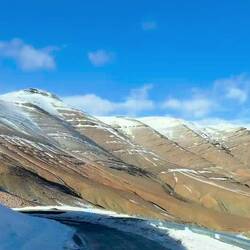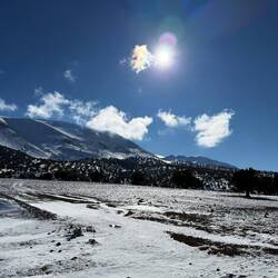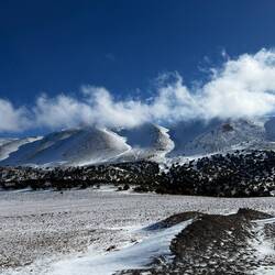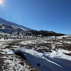 Nous avançons sur des pistes en montant à travers un paysage qui nous offre des vues à couper le souffle, dans un silence perturbé uniquement par le bruit du vent dans les rares arbres et arbustes. Bientôt, nous rencontrons la première neige, jusqu’à ce que le paysage en soit entièrement recouvert.