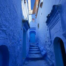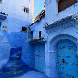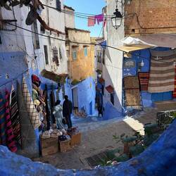 En partant de Fès, notre itinéraire nous a menés par les montagnes du Rif jusqu’à Chefchaouen, la ville bleue, nichée entre montagnes et bord de mer. La majorité des maisons sont peintes avec un bleu à base de chaux mélangée à des pigments naturels d’indigo. La médina nous accueille tranquillement, les touristes sont partis et les boutiques semblent somnolentes en attendant le printemps. Après Fès, où les « guides » et commerçants se sont montrés assez insistants, nous sommes sous le charme et apprécions les balades tranquilles dans les ruelles enchevêtrées.