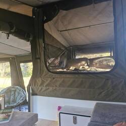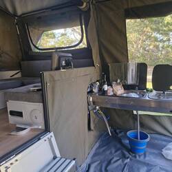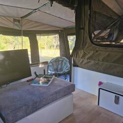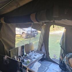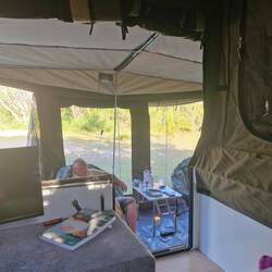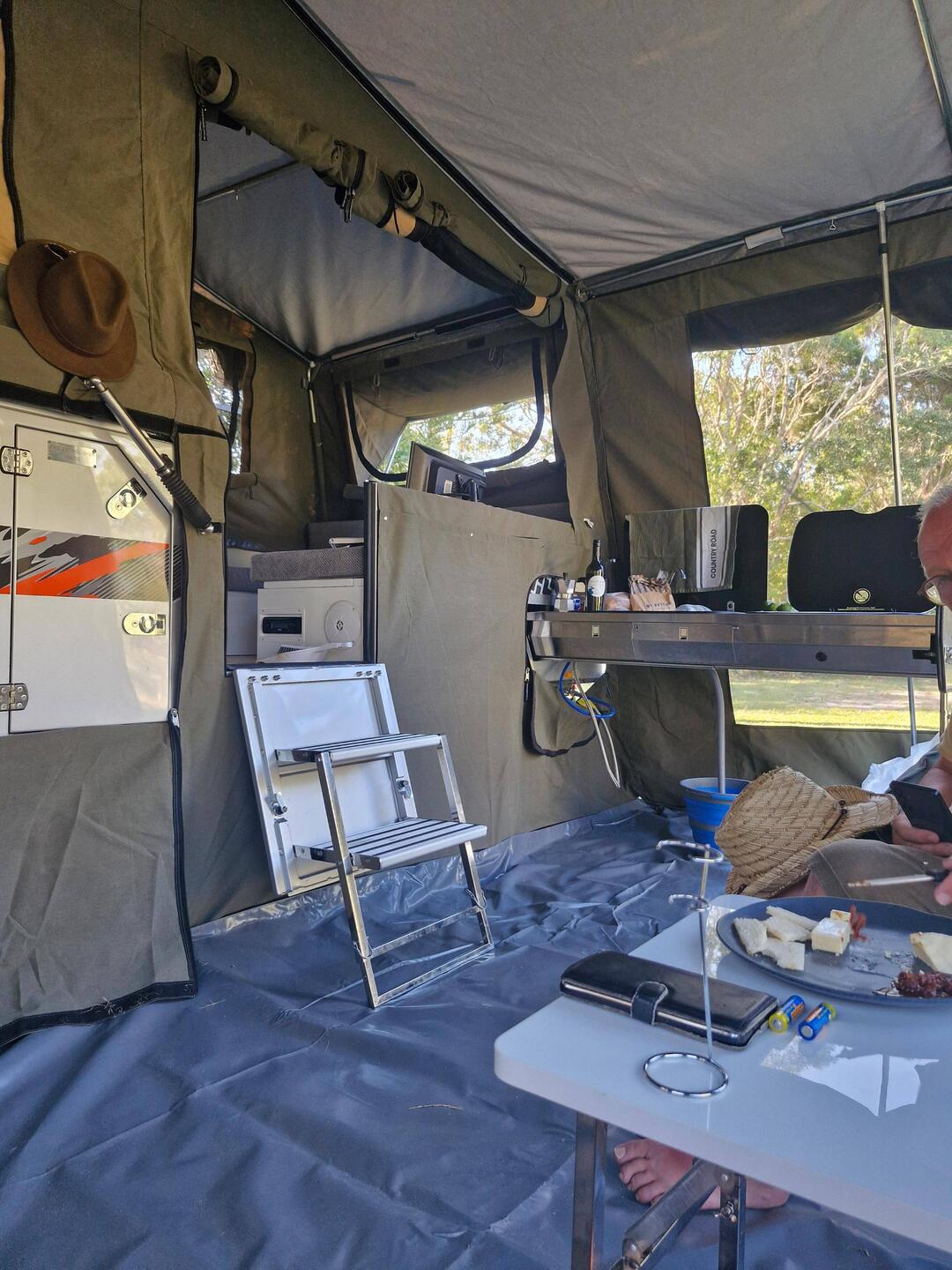 Wrestled with the full annex setup for 1/2 an hour - Little Bruce our camper trailer now morphed into a palatial four room palace! See Kitchen/dining/lounge, ensuite shower, club lounge, and bedroom!