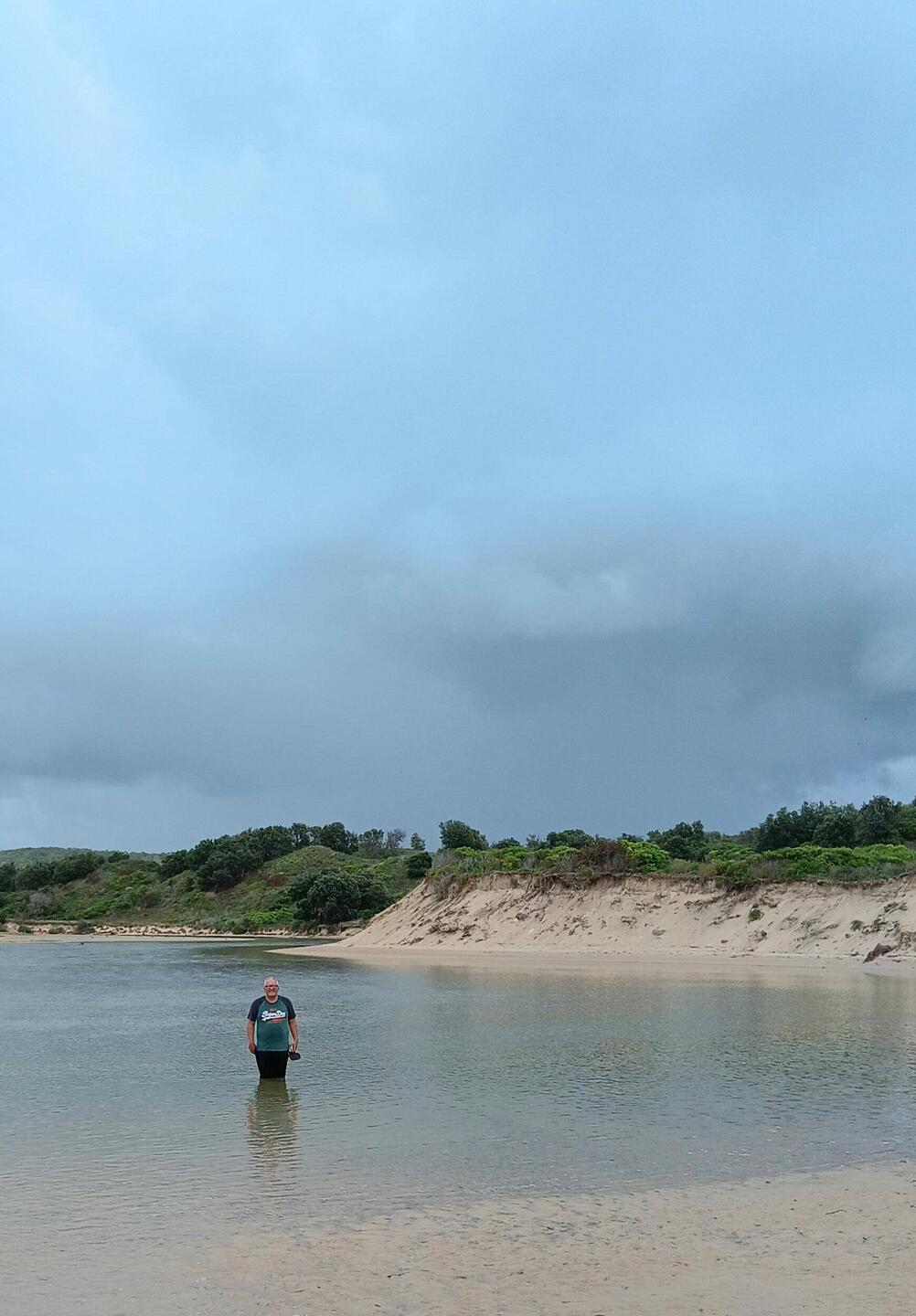 Alex checking depth of freshwater river on outgoing tide.
