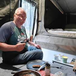 Persisting down with rain so we've converted the back of the trailer into romantic Japanese style resturant complete with table cloth using the Telstra phone Christmas wrapping paper. Ale.x hasLue lisää
