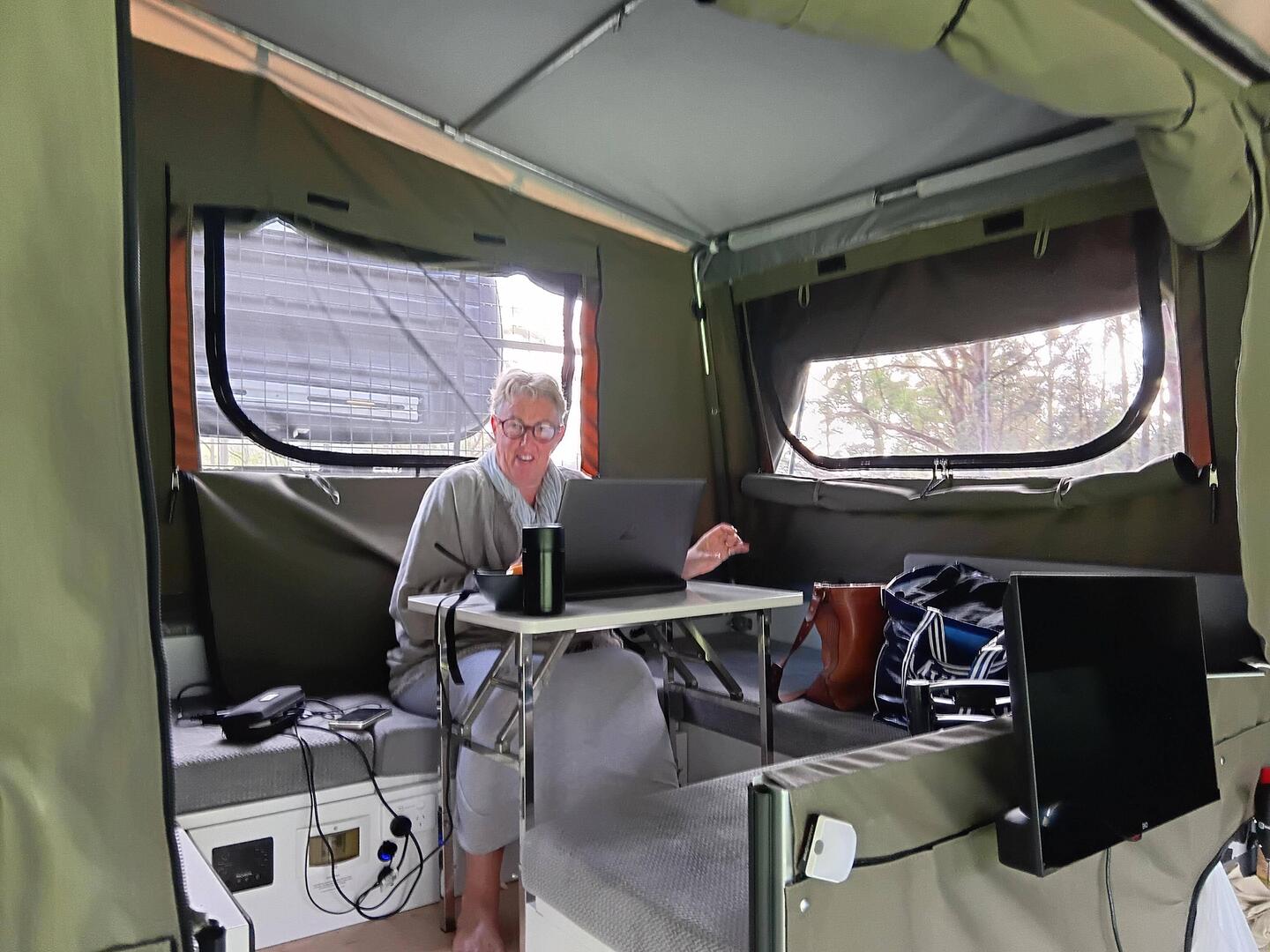 Julie doing 2 days a week from the camper with an in house waiter feeding her coffee and food