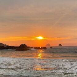 Willing to give him a second chance we set out on another sunset adventure. This time it was a resounding success! We passed around the rocks of a small headland onto the next beach which presented a clear track over the next headland from there. After a short walk through some shrubs we dropped straight onto Playa Cometa - the beach directly under the headland, Punta Cometa. We had packed some beers and a thermos of pre-batched Mezcalita (Margarita but made with the more local form of alcohol made from the Agave cactus, Mezcal). With his “take-everywhere” frisby we played a game while enjoying our drinks and then set up for the main event.