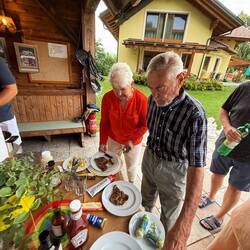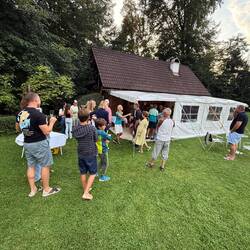 Denn gegen 19:00 Uhr erwartete uns eine Überraschung der ganz besonderen Art. Unsere Hausherren hatten ein kleines Festzelt aufgebaut und empfingen uns standesgemäß mit einem Gläschen Sekt. Schon das versprach Großes. Und was dann kam, übertraf jede Erwartung: